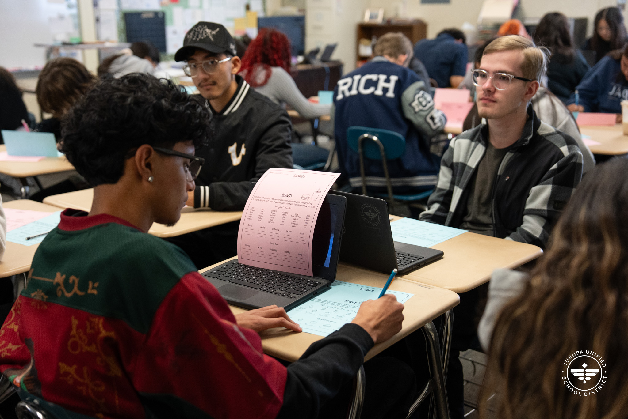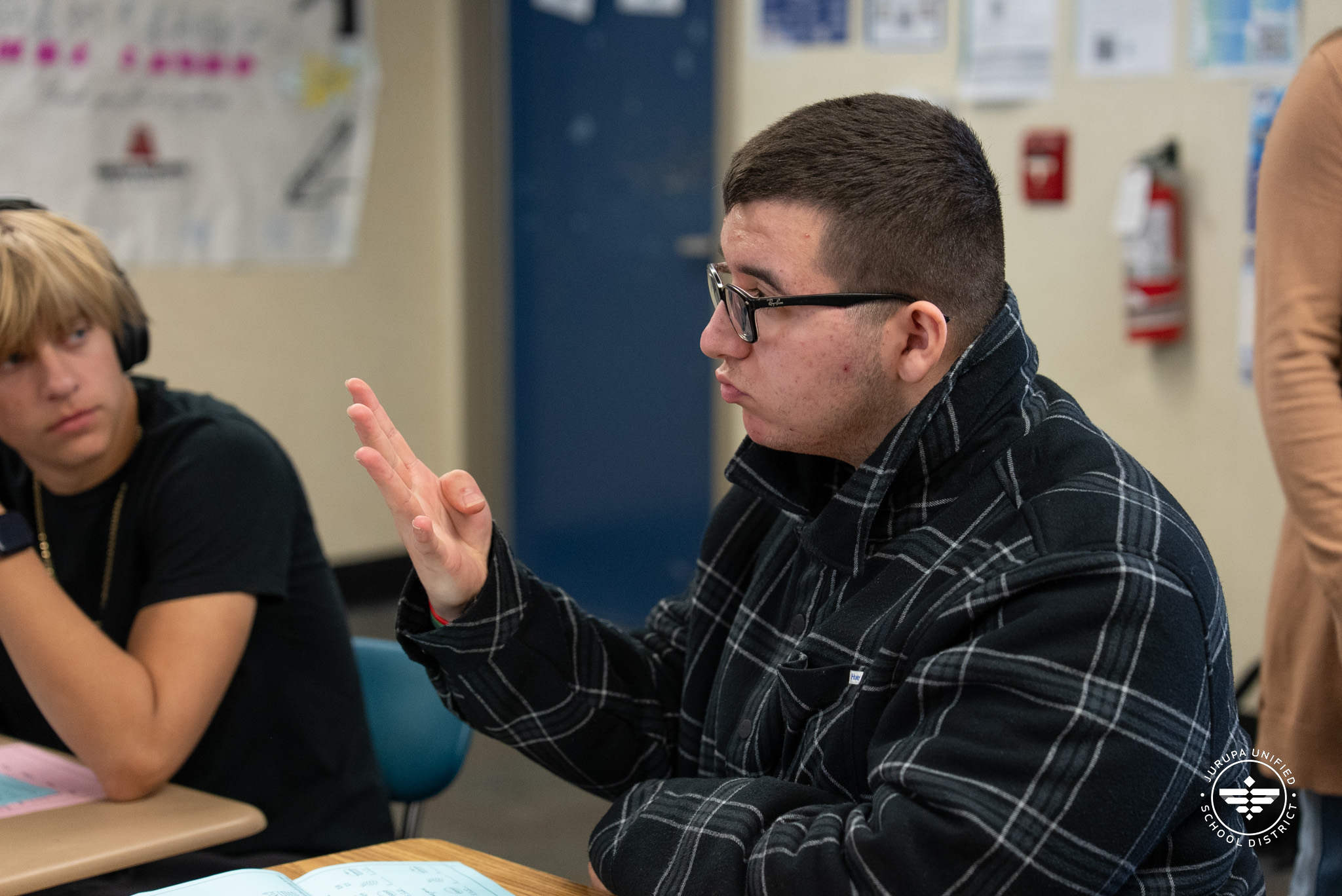 On a sunny Tuesday morning, Jurupa Valley High School students turned their desks to face one another to begin an assignment. Not one word is spoken, yet the room is full of conversation. Heads nod, palms are raised, and fingers sweep in various positions as they practice American Sign Language (ASL).