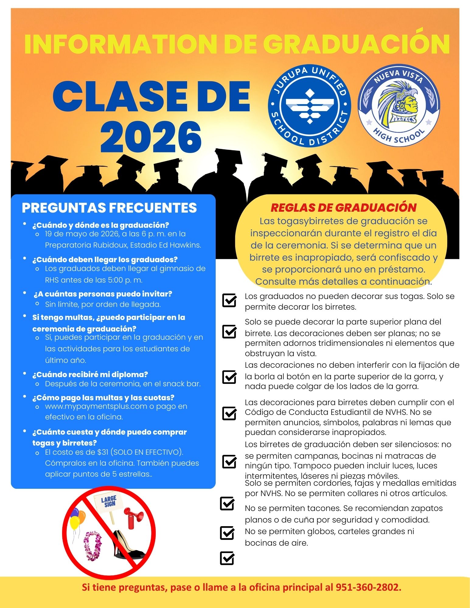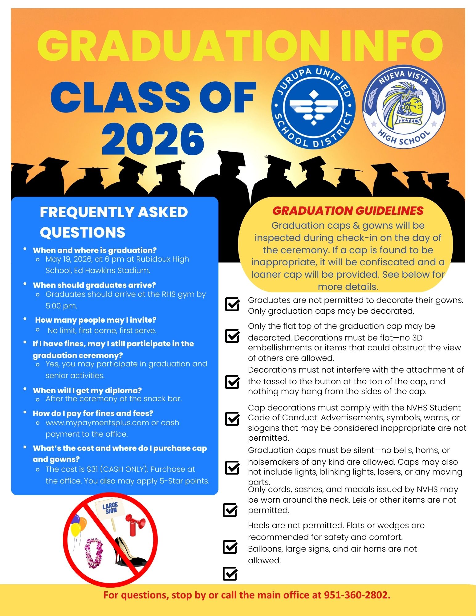 If you have any questions about what’s allowed, contact the main office at 951-360-2802.